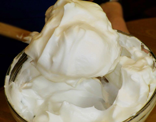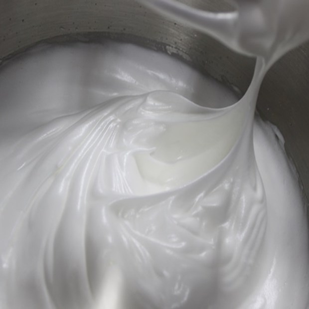 • Cho đường vào từ từ (chia 3 lần), tiếp tục đánh đến khi bông mềm, tạo chóp cong nhẹ.